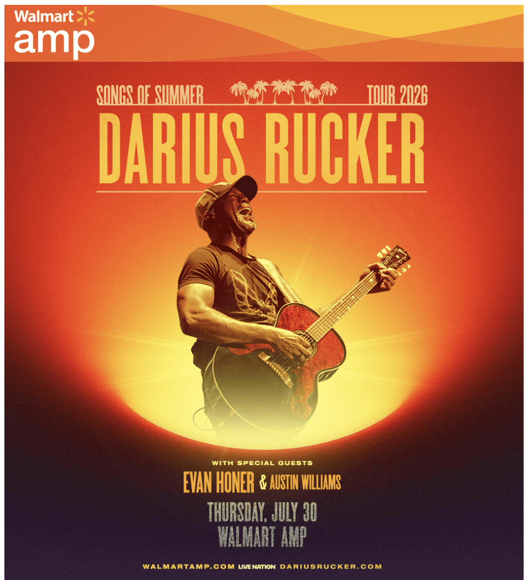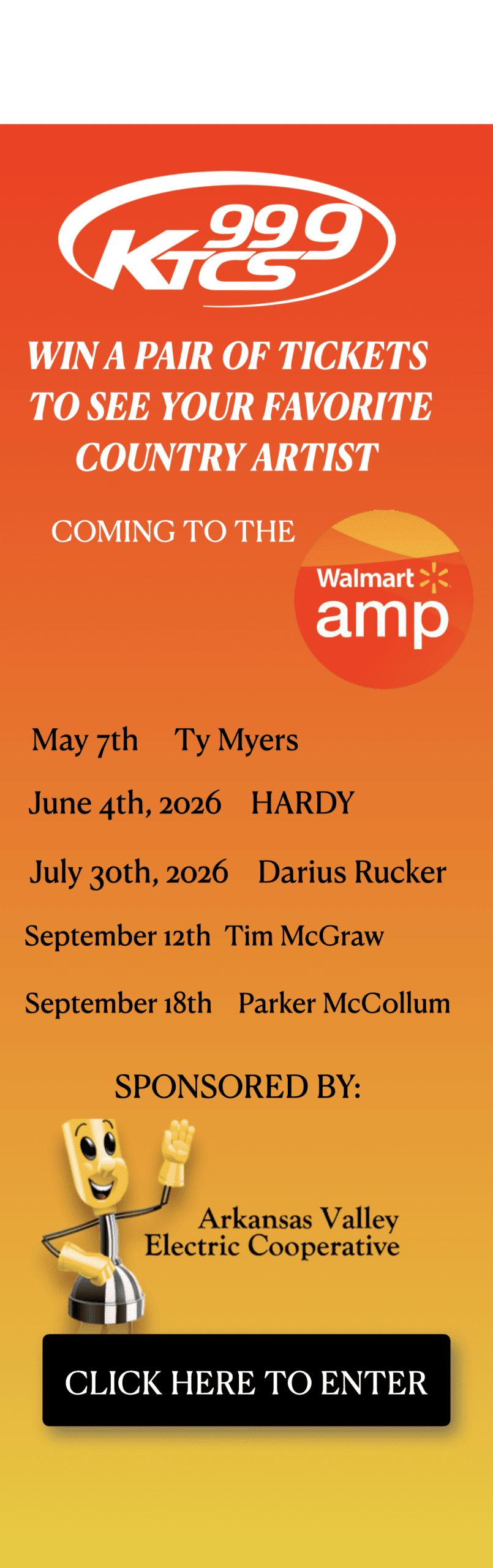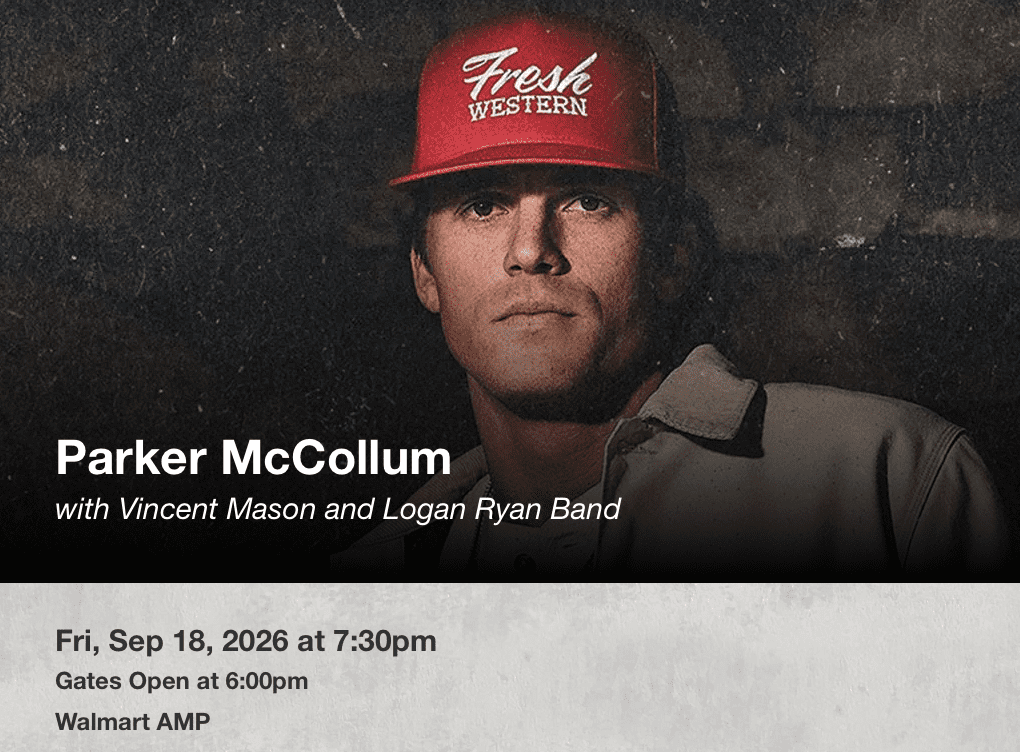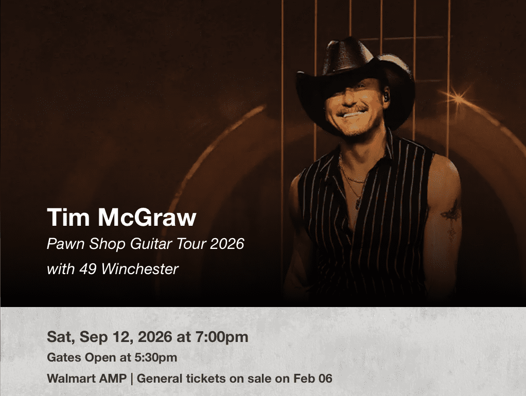 RULES FOR WINNING TICKETS: You may enter 1 time daily to win a pair of tickets. Multiple entries on same date will be deleted. You may select all the concerts you would like to go to see at the Walmart AMP. (concerts will be added when announced). Winner will be selected by drawing. Winner will receive 1 pair (2 tickets) digital. Winner will be notified by phone. Tickets are digital and will be sent to winner through email.